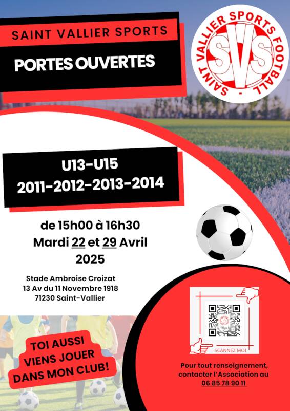 le club de Saint-Vallier Sports Football organise les 22 et 29 avril 2025, une journée portes ouvertes réservée au U 13 et U 15 (2011, 2012, 2013 et 2014), de 15h à 16h30 au stade Ambroise Croizat de Saint-Vallier.