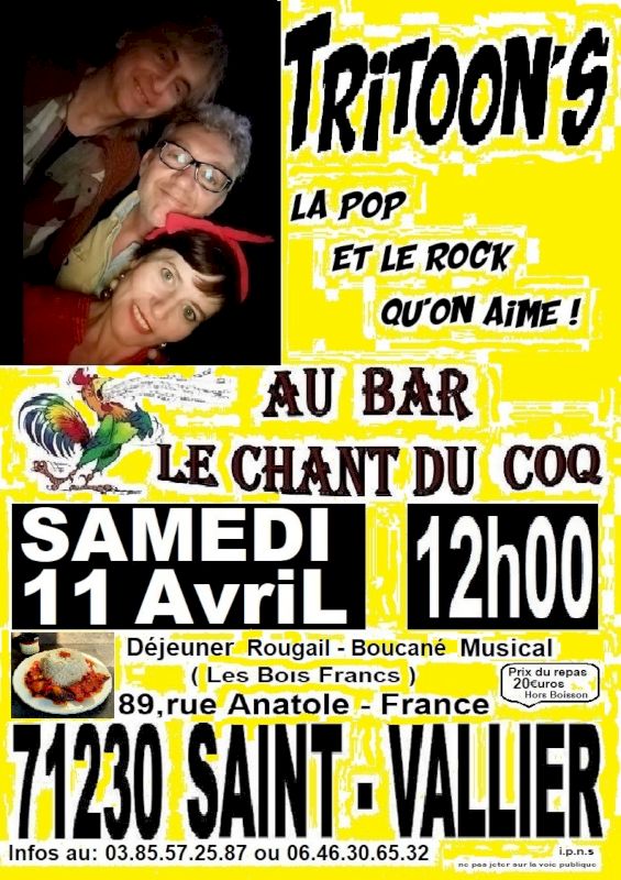 Samedi 11 avril 2026, à 12h, un peu avant mais pas trop après, venez déjeuner au bar du Chant du coq à Saint-Vallier pour partager un plat typiquement de La Réunion, le rougail boucané, le tout accommodé d’une bonne dose de pop et de rock avec le groupe Tritoon’s.