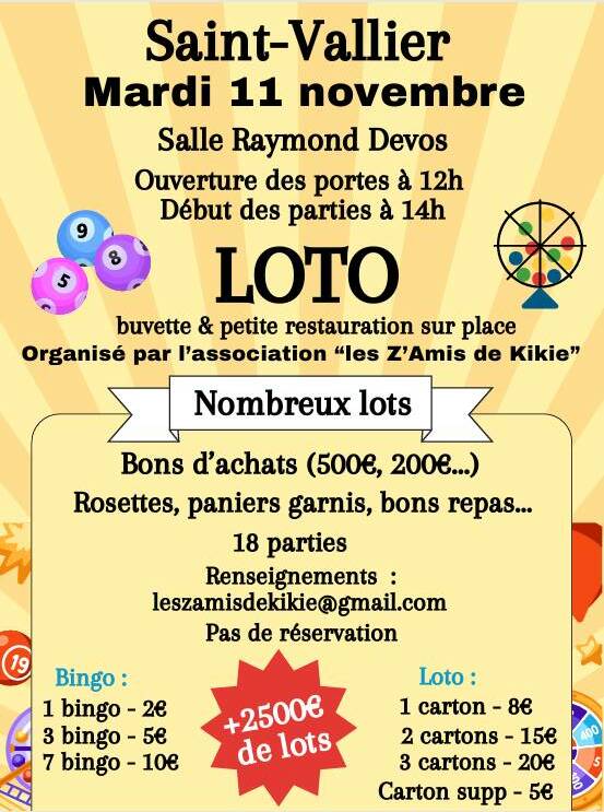 Donc, l’association « Les Z’Amis de Kikie », de Saint-Vallier, organise le mardi 11 novembre 2025 un loto à la salle Raymond Devos.
