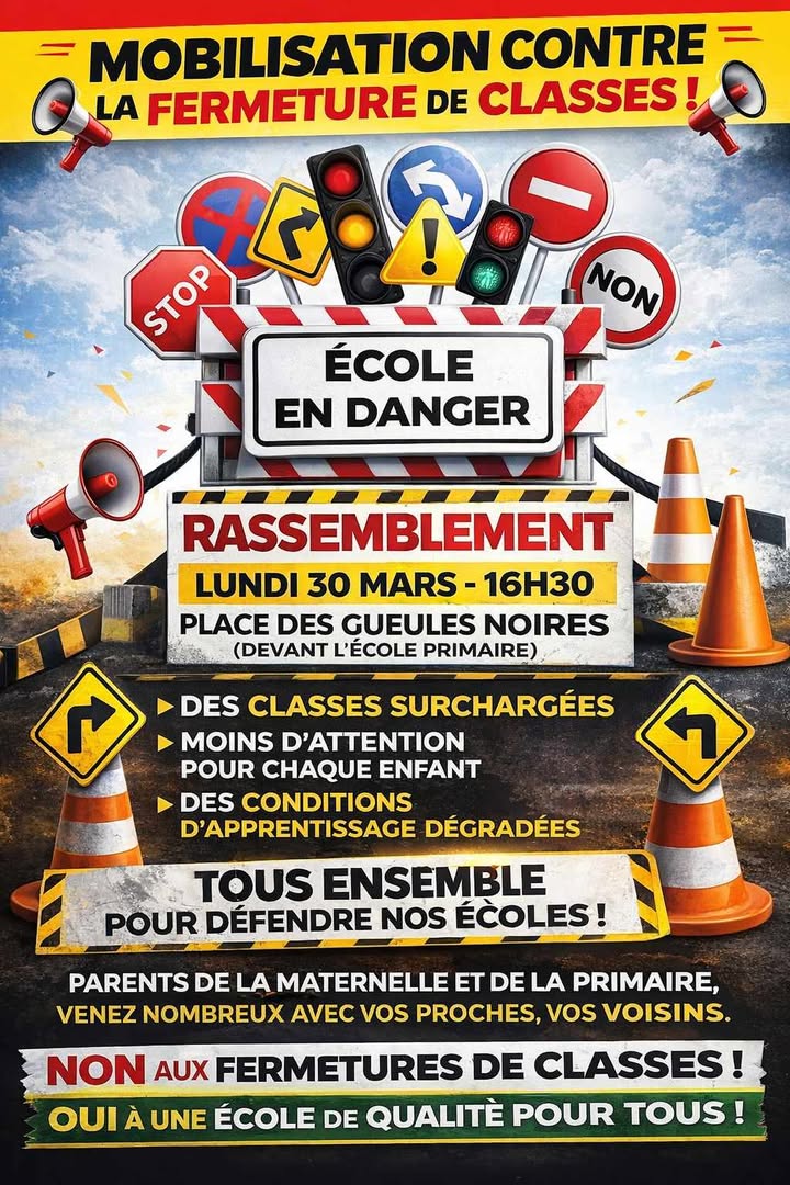 Ils on décidé de se mobiliser ce lundi 30 mars 2026 à 16h 30 sur la place des Gueules Noires devant l’école primaire.