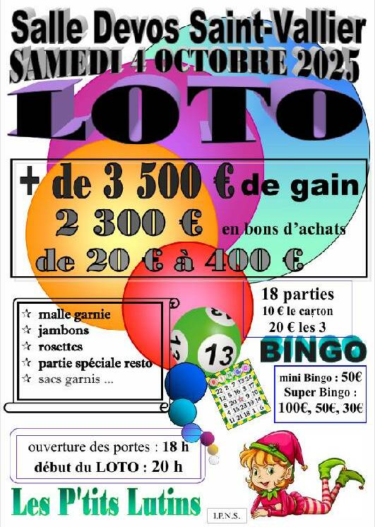 L’association des P’tits Lutins de Saint-Vallier organise son loto le samedi 4 octobre 2025 à 20H, salle Devos aux Bois Francs.