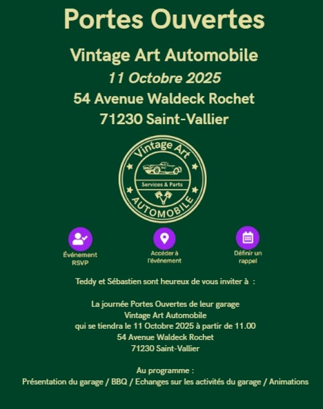 Le moment est venu de mieux connaître Vintage Art Automobile à l’occasion des portes ouvertes qui auront lieu samedi 11 octobre 2025 au 54 avenue Waldeck Rochet à Saint-Vallier à partir de 11h.