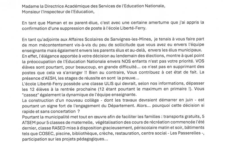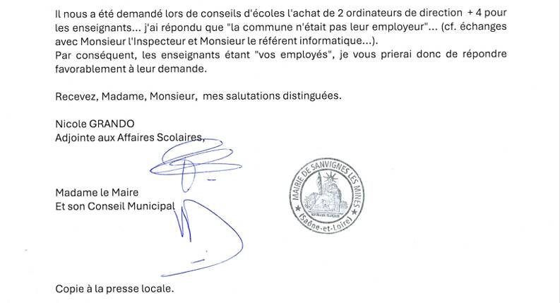 Nous publions la réponse de Nicole Grando, adjointe aux affaires scolaires à Sanvignes à la DASEN qui ne manque pas de piquant :