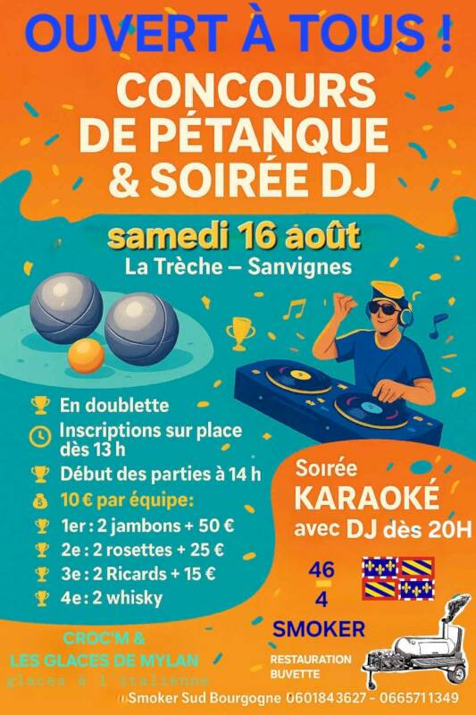 Samedi 16 août 2025 à la Trèche à Sanvignes, le club de smoker sud bourgogne (46-4 smoker) organise un concours de pétanque en doublette à partir de 13h (inscriptions) puis, dans la soirée, à partir de 20h, un karaoké avec DJ.