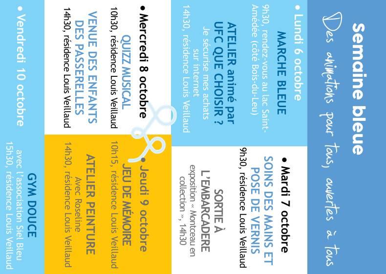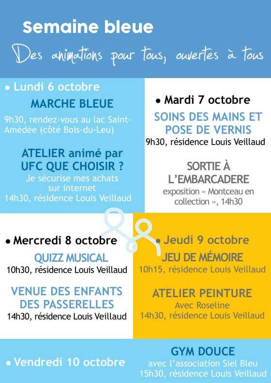 Voici donc le programme de la semaine bleue, de nombreuses animations y sont prévues : Marche bleue, ateliers bien-être ou artistique, échanges, sorties…
