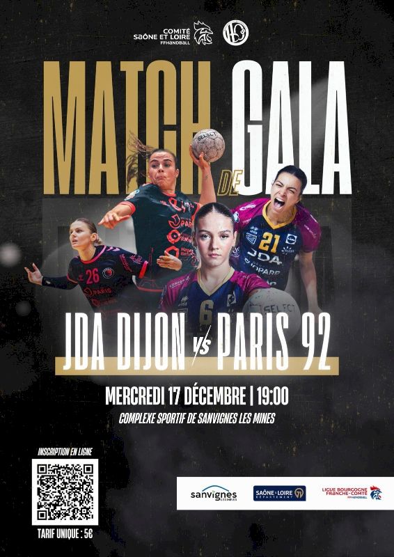 Attention pas de vente de billet le jour du match, les billets sont à prendre via le QR Code sur l’affiche ou en cliquant sur le lien suivant : https://www.helloasso.com/associations/comite-de-handball-de-saone-et-loire/evenements/jda-paris-92