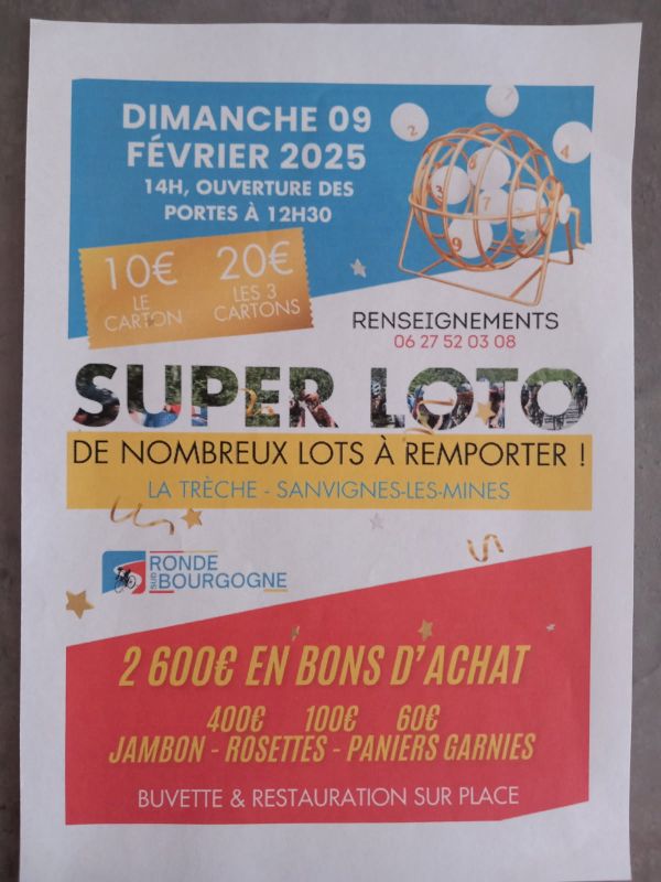 Dimanche 9 février 2025, la Ronde Sud Bourgogne organise un super loto avec de nombreux lots à remporter dont 2 600 euros de bons d’achat, à la Trèche à Sanvignes.