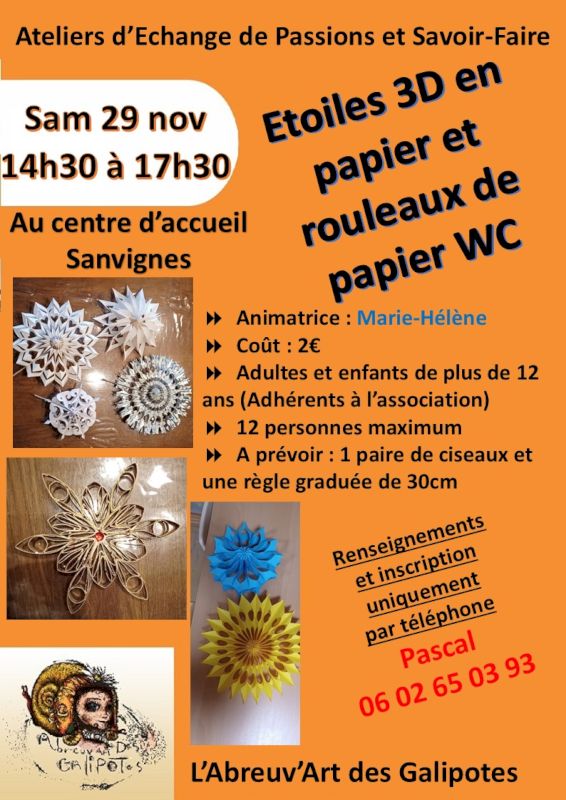 Vous pensiez que vos rouleaux de papier toilette vides finiraient tristement à la poubelle ? Détrompez-vous ! L’Abreuv’Art des Galipotes a décidé de leur offrir une seconde vie… étincelante ! Lors de son prochain atelier d’échange de passions et savoir-faire, venez transformer ces modestes cylindres en étoiles 3D du plus bel effet. Oui, oui, des étoiles. En papier. Et en rouleaux de WC. Rien que ça.
