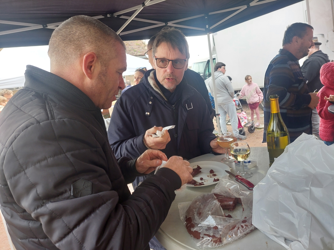 Sur place, on pouvait déguster le boudin chaud, l’emporter à la maison, ou encore repartir avec d’autres spécialités comme le fromage de tête ou les savoureux crapiauds à la treuffe. À l’heure du déjeuner, près de 150 convives se sont attablés pour partager un moment gourmand et chaleureux, fidèle à l’esprit de La Ronde Sud de Bourgogne.