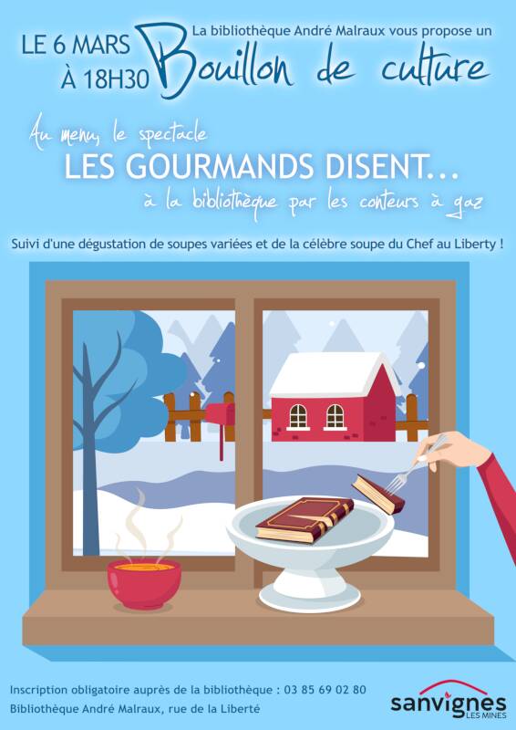 La soirée se fera en deux temps, d’abord à la bibliothèque André Malraux avec un menu « spécial » spectacle « Les gourmands disent » par les Conteurs à gaz avant de traverser la rue et se rendre au Liberty pour une dégustation de soupes variées dont la célèbre soupe du Liberty.