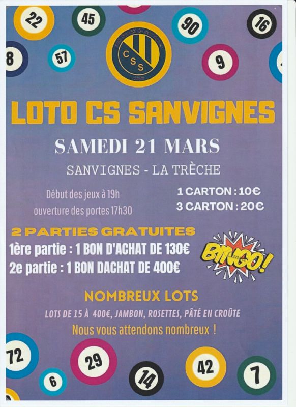 Le C.S. SANVIGNES organise un loto le samedi 21 Mars, à la salle de La Trèche à Sanvignes.