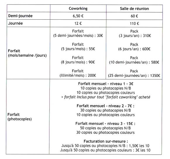 La salle connectée et les espaces de coworking sont disponibles à la location sur la demi-journée ou la journée. Des forfaits mensuels et packs annuels ont également été conçus pour les personnes souhaitant venir régulièrement dans l’espace. Une grille tarifaire a été établie par délibération du conseil municipal :