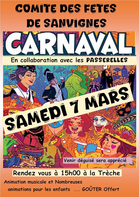 Le comité des fêtes de Sanvignes avec la collaboration du centre social Les Passerelles, organise un carnaval, samedi 7 mars 2026 à partir de 15h à la Trèche.