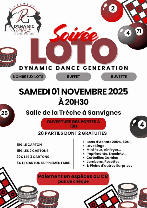 Le Dynamic dance Generation de Sanvignes organise un loto le samedi 1er novembre 2025 à la salle de la Trèche de Sanvignes à 20h30.