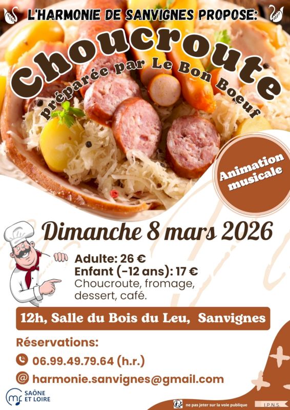 Rendez-vous dimanche 8 mars 2026 à partir de 12h à la salle du Bois du Leu à Sanvignes avec animation musicale, évidemment.