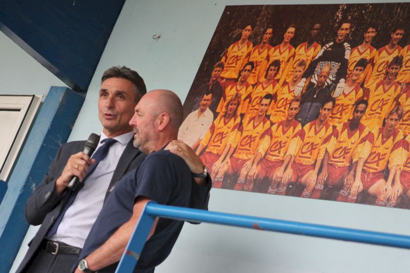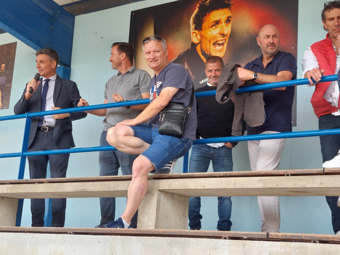 Nous voilà donc le 8 juin 2025. A l’entrée du stade, Guillaume Warmuz et Hervé Mazurek, dévoilent la plaque. Le rêve devenait réalité sous les yeux de ses plus chers camarades de club de l’US Blanzy, cette formidable équipe cadette de 1986. « C’était l’apothéose. Cette année nous avons gagné le tournoi international de Blanzy et, le plus fort, nous sommes devenus champions de Bourgogne contre l’AJ Auxerre et un certain Guy Roux » se souvient Guillaume Warmuz au fur et à mesure qu’il dévoile en haut de la tribune, d’immenses photos de son ascension.