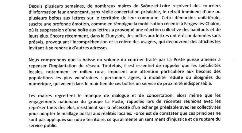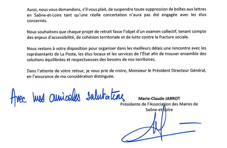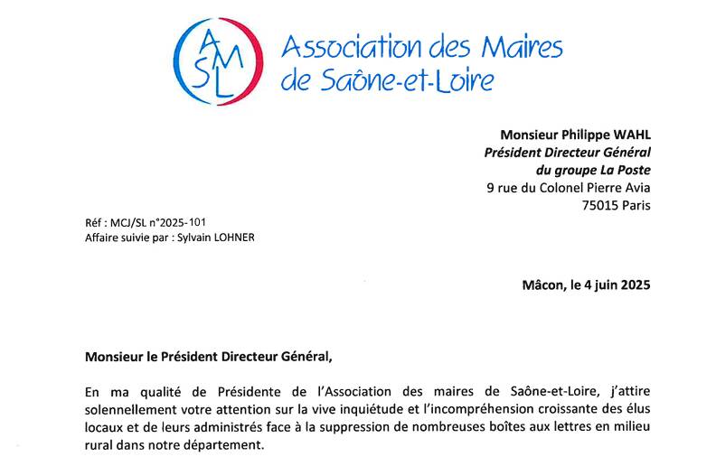 Nous publions le courrier que Madame Marie-Claude Jarrot, Présidente de l’AMSL (association des maires de Saône-et-Loire), vient d’adresser à Monsieur Philippe Wahl, Président du groupe La Poste, au sujet des suppressions de boites aux lettres dans un certain nombre de communes de Saône-et-Loire.