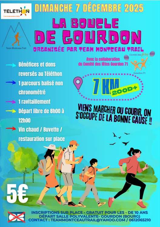 À l’occasion du week-end du Téléthon, l’association sportive Team Montceau Trail organise dimanche 7 décembre 2025 la Boucle de Gourdon, une marche solidaire dont l’ensemble des bénéfices et dons seront reversés au Téléthon. L’événement est proposé en collaboration avec le Comité des Fêtes de Gourdon, qui assurera la buvette, la petite restauration ainsi que le traditionnel vin chaud.