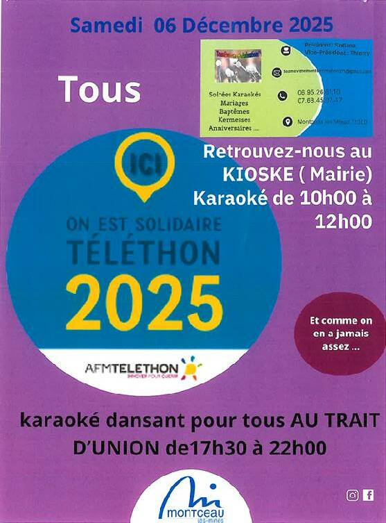 L’association team evenements animations 71 organise un karaoké le samedi 6 décembre 2025 sous le kiosque vers la mairie de Montceau les Mines de 9h00 à 12h00 et l’après-midi de 17h00 à 22h00 au centre social le Trait d’Union.
