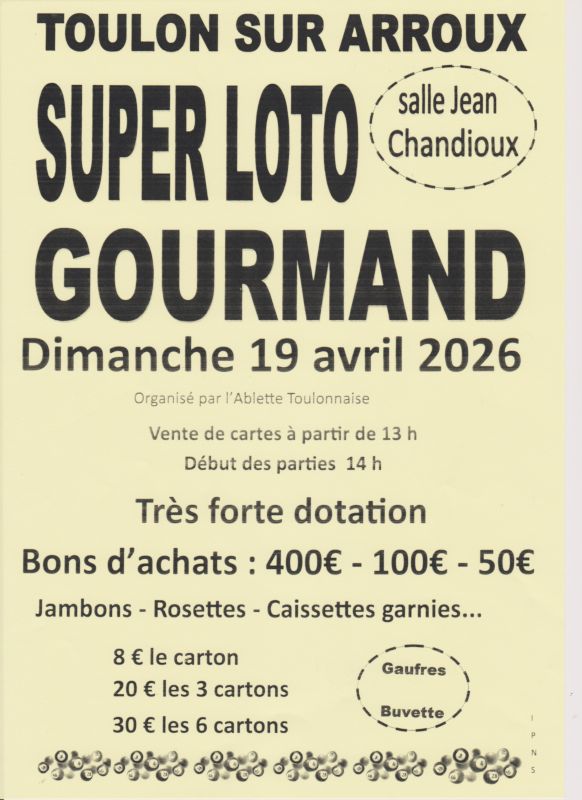L’Ablette Toulonnaise organise un LOTO GOURMAND le dimanche 19 avril 2026 à la Salle Jean Chandioux à Toulon-sur-Arroux