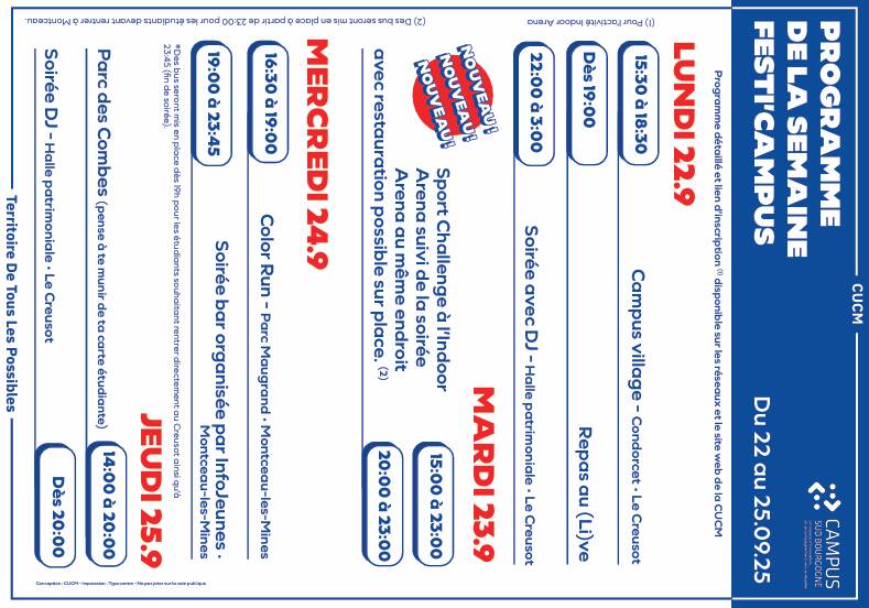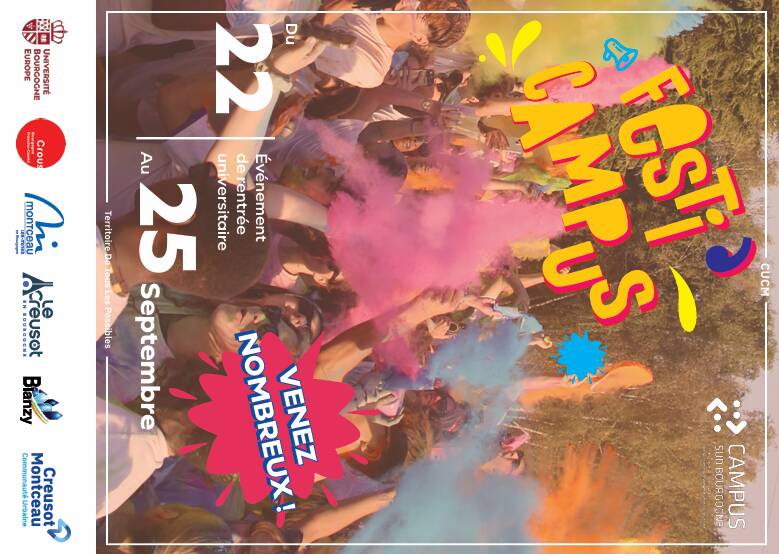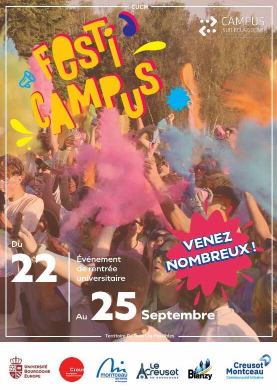 Du 22 au 25 septembre 2025, le campus Sud Bourgogne vibrera au rythme du Festi’Campus, un événement festif et convivial imaginé par les associations étudiantes, pour tous les étudiants du territoire de la Communauté Urbaine Creusot Montceau (CUCM).