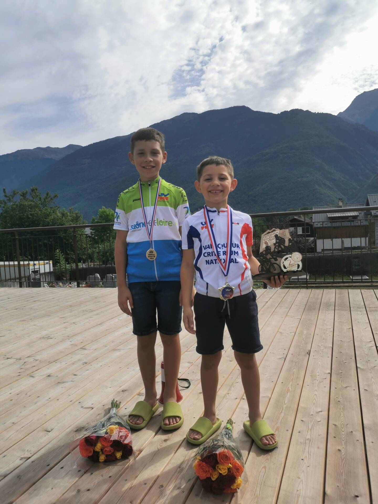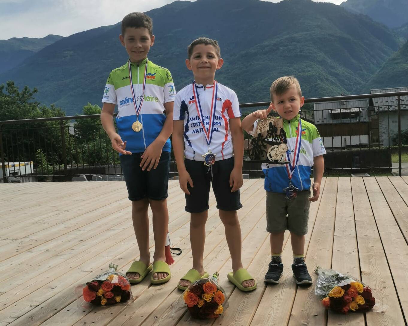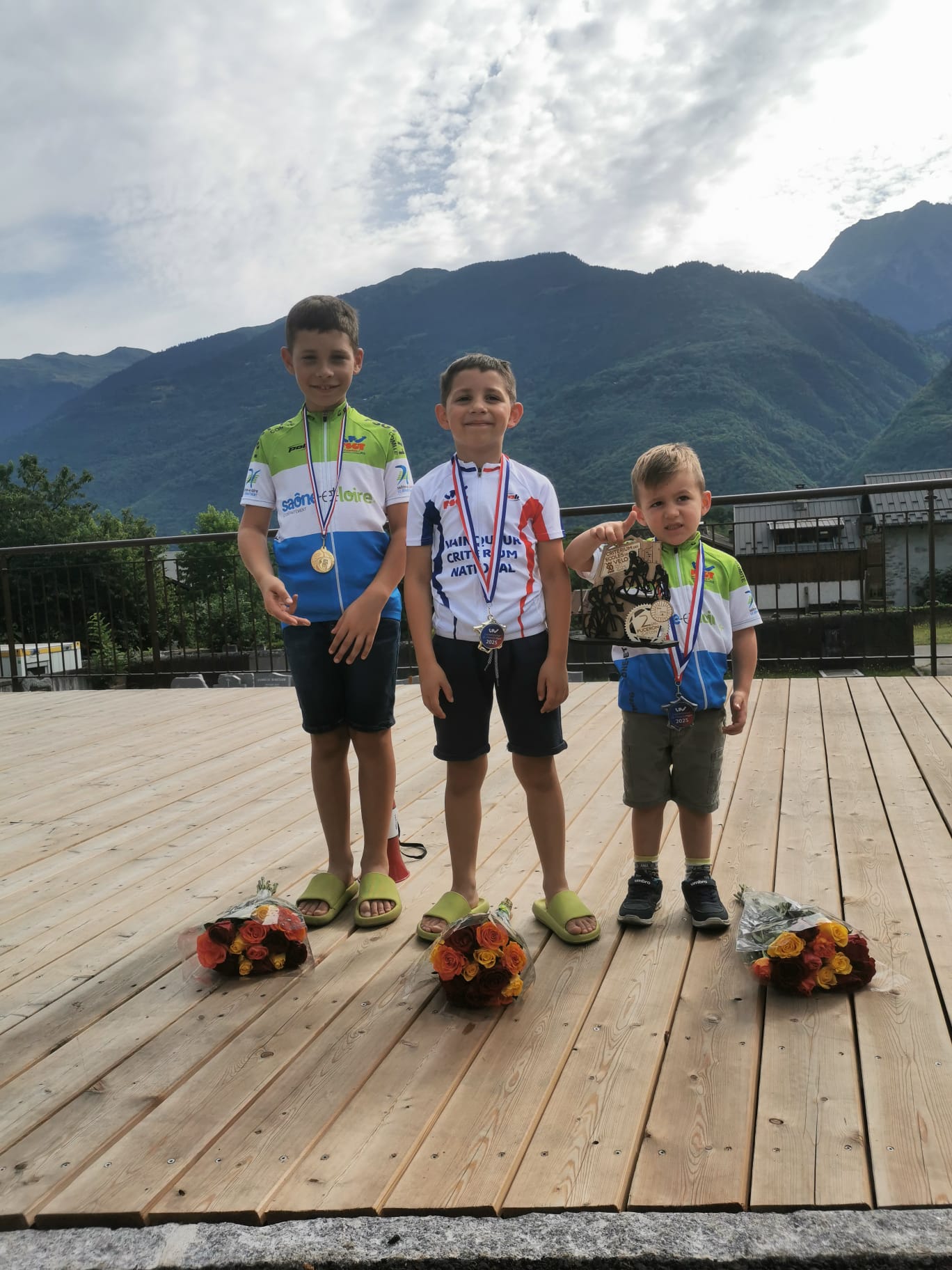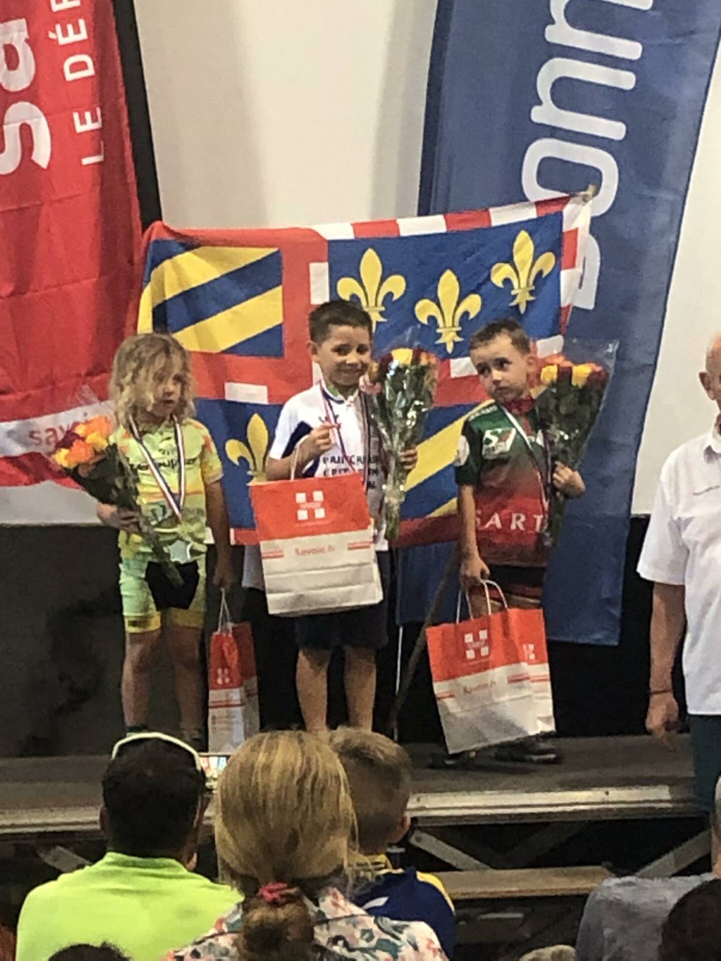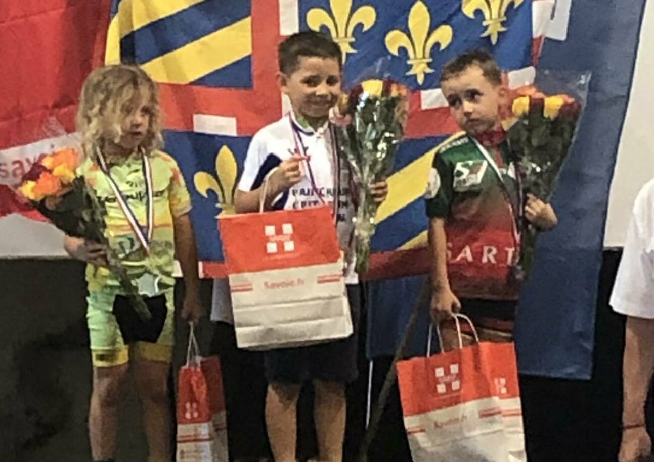 En moustique : Côme BAILLY-CORNOT est champion fédéral. Quelle catégorie passionnante! En effet, les 3 premiers coureurs terminent à égalité de points. Grace à son sans-faute aux jeux d’adresse et sa 2ème place en course, il s’offre son premier maillot national.