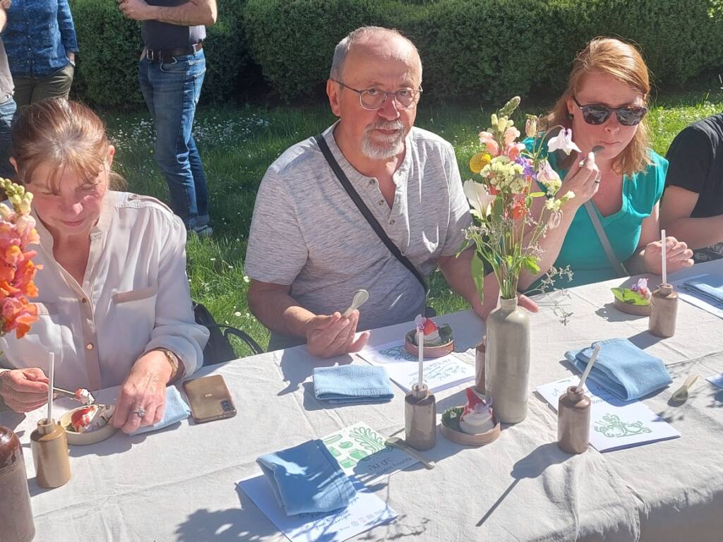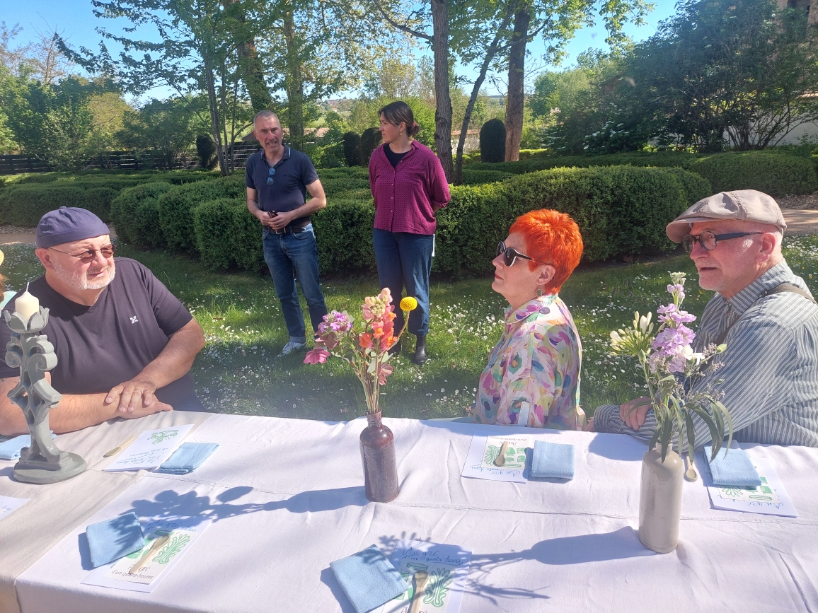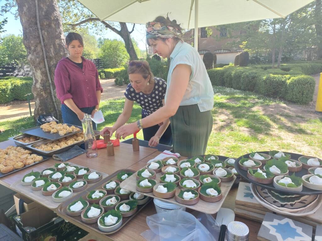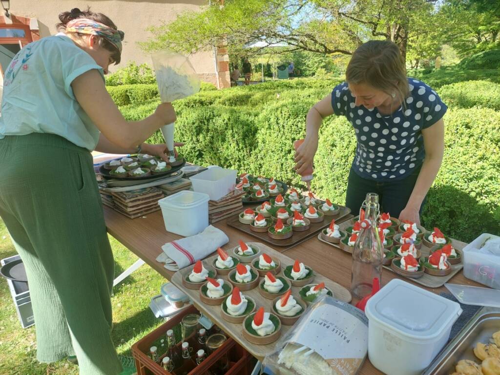 Le goûter lui-même relevait d’une délicate mise en scène. Harmonie Bégon, également cuisinière, était accompagnée de Pauline, du Vent dans les Fleurs, et d’Hélène, de l’auberge Sôla. Ensemble, elles ont composé une partition gourmande et florale : pavlova aux fraises et coulis de rose, sablé au sarrasin escorté d’une panna cotta à l’agastache, chouquettes parfumées à la verveine, crapiaux aux pommes, compotée de rhubarbe à la mélisse, tartelette au lilas, gâteaux aux épices relevés de poivre de cassis… Autant de douceurs, offertes comme des gestes, à la fois simples et précieux. C’était un festin pour les yeux autant que pour le goût.