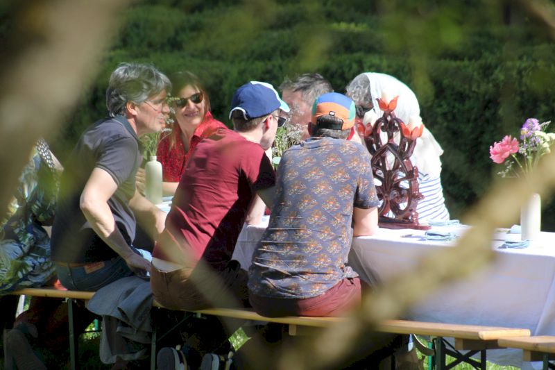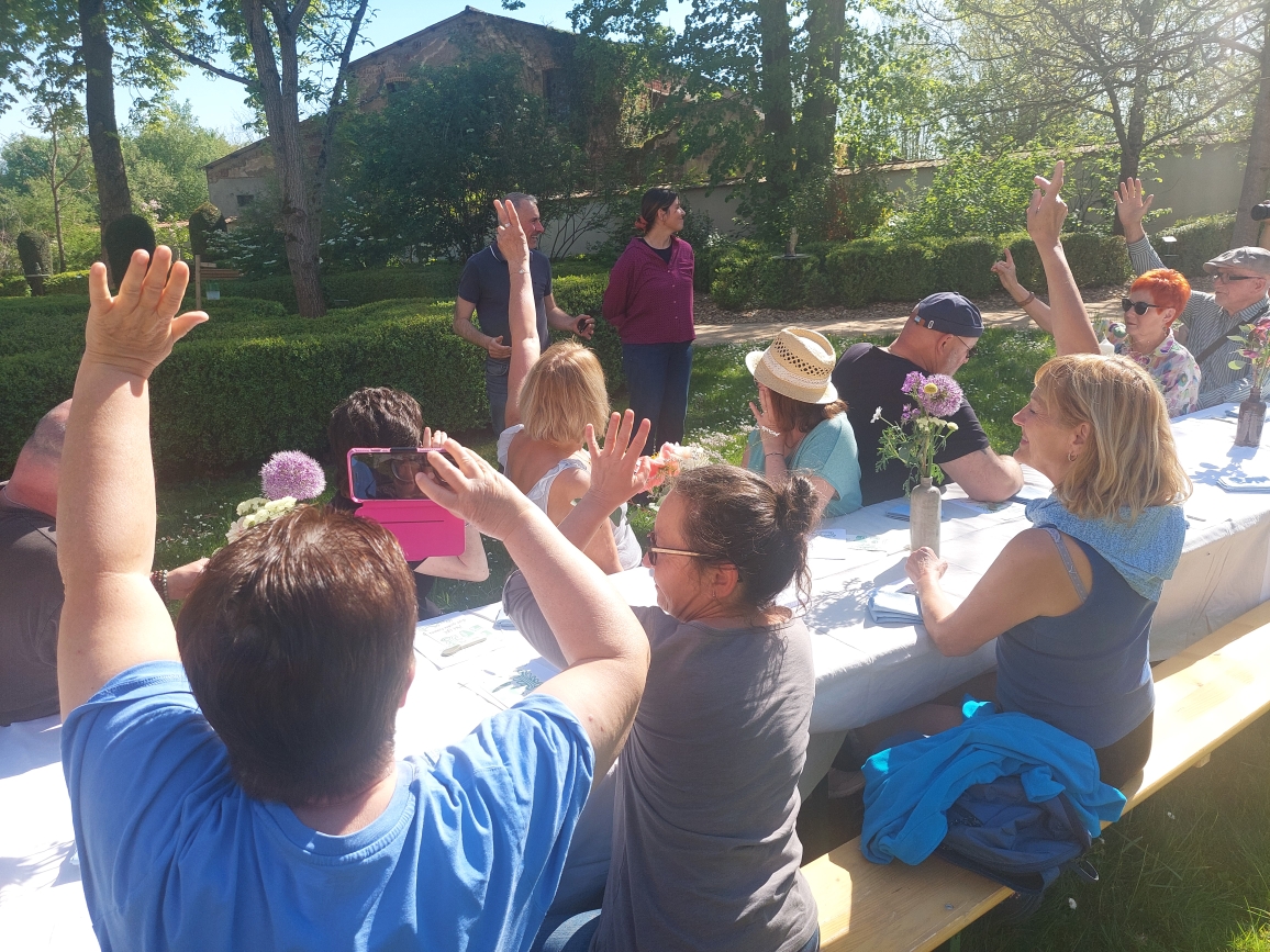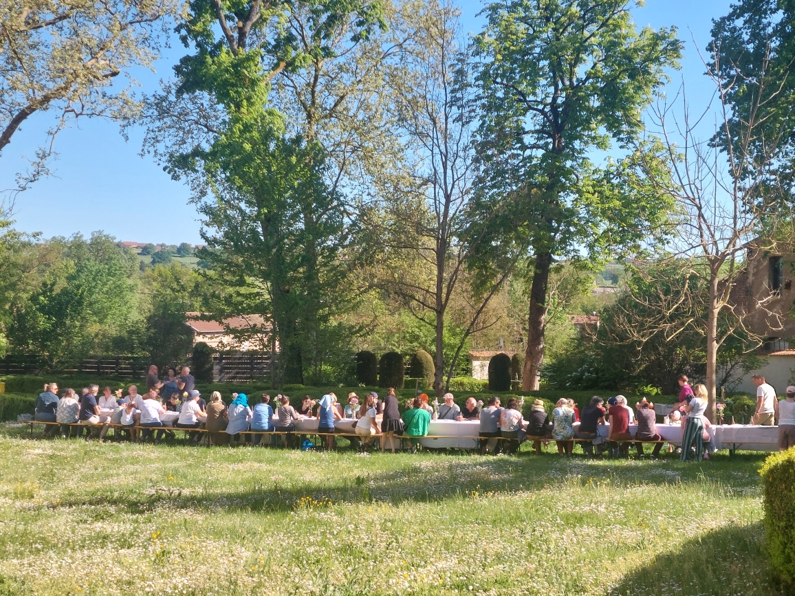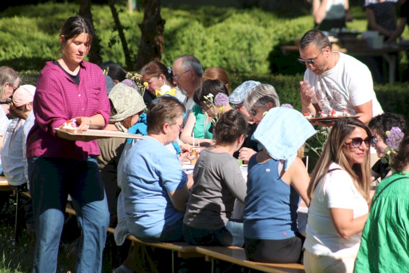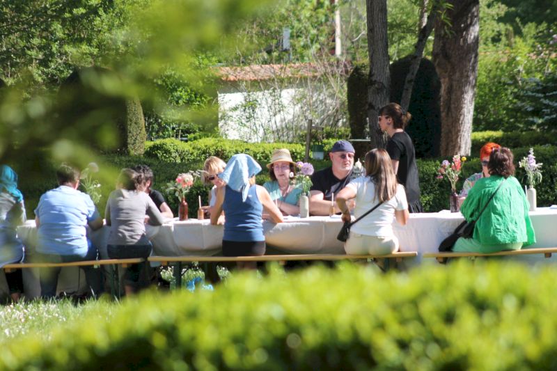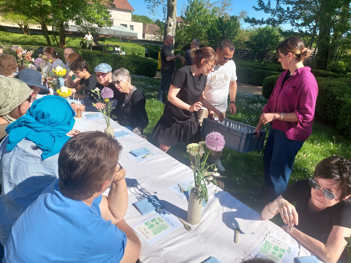 Le goûter lui-même relevait d’une délicate mise en scène. Harmonie Bégon, également cuisinière, était accompagnée de Pauline, du Vent dans les Fleurs, et d’Hélène, de l’auberge Sôla. Ensemble, elles ont composé une partition gourmande et florale : pavlova aux fraises et coulis de rose, sablé au sarrasin escorté d’une panna cotta à l’agastache, chouquettes parfumées à la verveine, crapiaux aux pommes, compotée de rhubarbe à la mélisse, tartelette au lilas, gâteaux aux épices relevés de poivre de cassis… Autant de douceurs, offertes comme des gestes, à la fois simples et précieux. C’était un festin pour les yeux autant que pour le goût.
