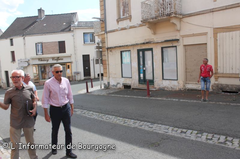 L’îlot de l’ancien Casino à Perrecy-les-Forges (à droite sur la phot), c’était au cours d’une visite du président de la CUCM en août 2020. Quel projet pour ce bâtiment à l’abandon ?