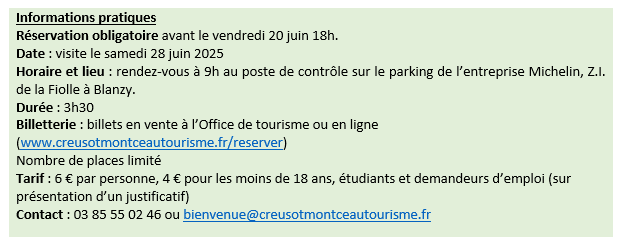 Actualisé : les inscriptions sont terminées, c’est complet. Dans les coulisses de l’industrie : visite de l’entreprise Michelin Blanzy, samedi 28 juin 2025 à 9h.
